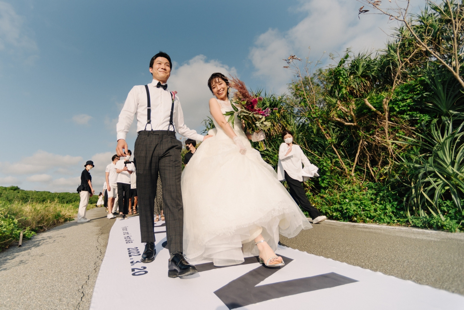 痕跡を残すかのように上空から確認できるほどの50mのバージンロード、 沖縄の大自然に存在感と違和感たっぷりに表現した会場至る所に置かれた白いBOX、結婚式1ヶ月前から特設WEBサイトでふたりのこれまでの人生のとゲストひとりひとりに当てられたエピソードを毎週配信をした。